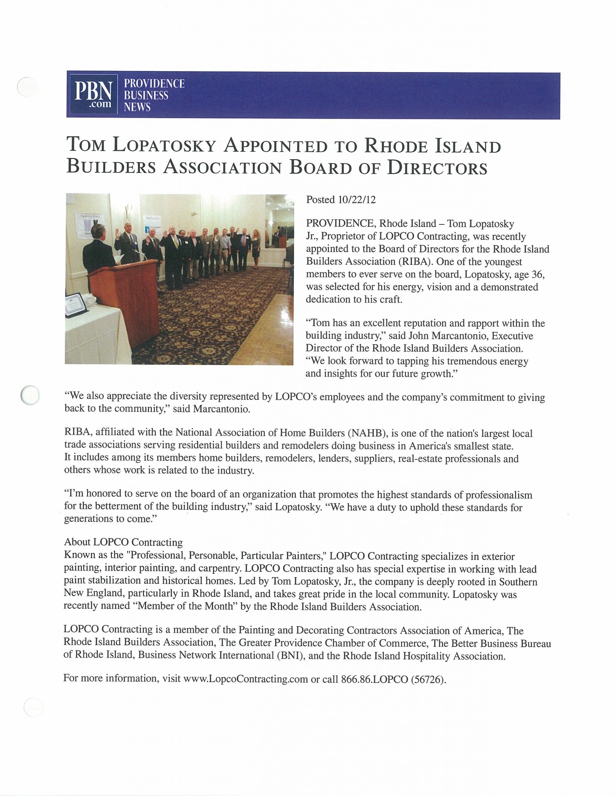 Tom lives in East Providence, RI with his girlfriend Leslie and his daughters Tamara & Ivelisse. Tom has held a variety of titles over the years including President of LOPCO Contracting, Regional Board Member of the PCA’s (Painting Contractors Association) Northeast Council, President of the RI Chapter of the PCA, Board Member of RIBA (Rhode Island Builders Association), and Building & Property Trades Advisory Committee Member for MTTI (MotoRing Technical Training Institute in Seekonk, MA).