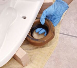 – a ring made out of a very tacky wax which aids in forming a watertight seal at the point where the bottom of the toilet and the top of the sewer pipe meet.