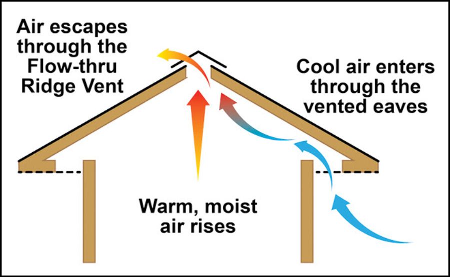 As this air warms slightly, it rises and exits through the ridge vent at the top of the roof.