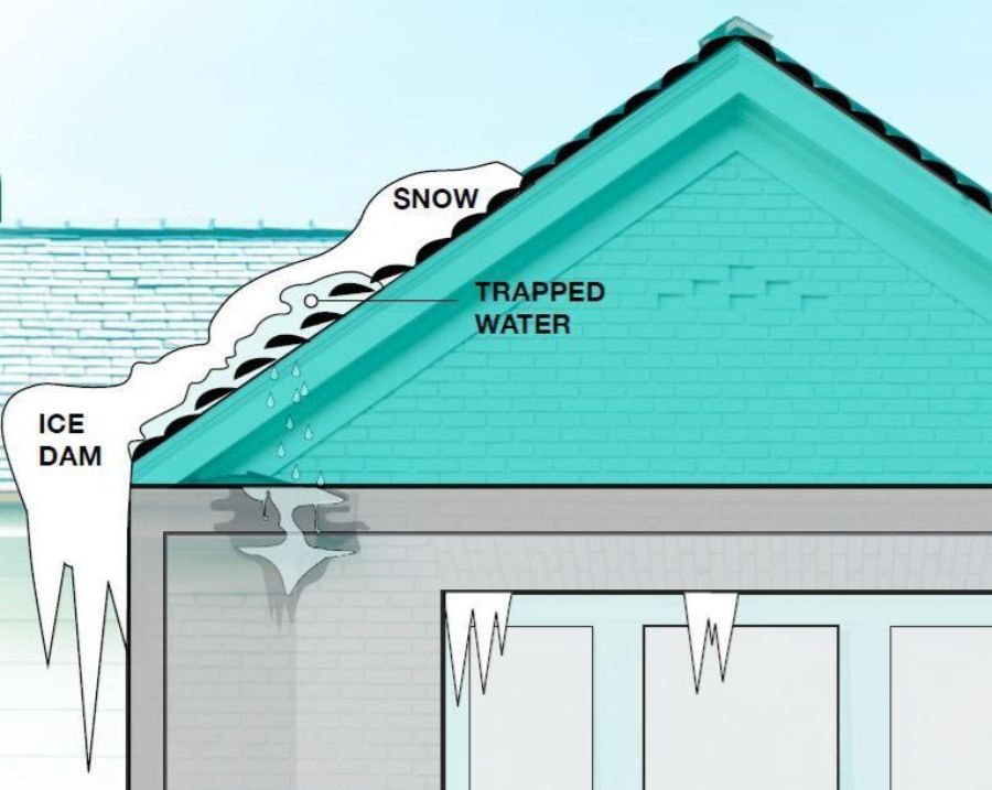 When snow melts on a roof and refreezes at the edge, it forms a block of ice that traps water.